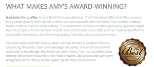 The apples are delicious. The apples themselves are crispy and juicy and sweet. The toppings are awesome and creative. We have found that they make great gifts (even for foodies) and are popular at parties.